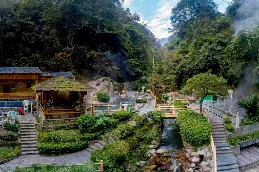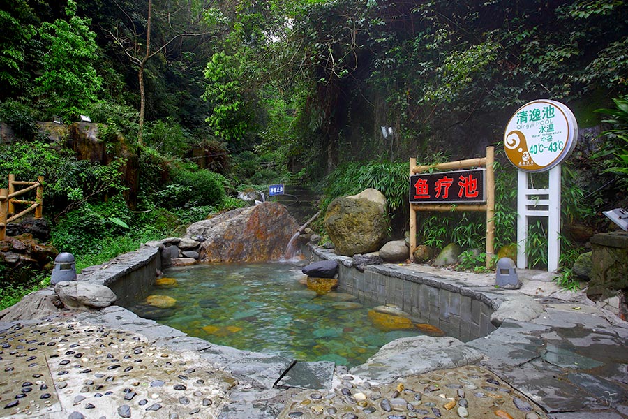 Longsheng Hot Spring Holiday Resort is a province-level resort embraced by mountains of Cambrian system; the fault zone reaching a length of tens of thousands of kilometers between the Baiya Mountain (白崖岭) and the Tian'ejie (天鹅界) is the main passage of the 16 streams of Longsheng hot springs, which rises up from the rock stratums 1200 beneath the ground with a temperature of 45℃-58℃. According to tests by national experts, Longsheng hot springs contain more than ten trace elements which make the water natural drinking water. Medically, the trace elements are also believed to be good for treating many diseases such as cardiovascular diseases, neuralgia, arthritis, diabetes mellitus, gout, dermatosis. These advanced natural conditions make it an ideal place for tourism, holidays, relaxation and health.
