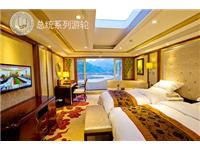 The luxury cruise ships President 7 and 8 will begin their voyage in April, 2013. As sister ships of the same class and design, they are 146.8 meter in length and 20.2 meter in width, making them the largest cruise ships Changjiang Shipping has designed so far. They each contain 215 luxury standard rooms, 13 luxury executive rooms on the top deck, and 2 presidential suites on the fore side of 3rd deck, totaling 230 rooms for 460 guests. They also considered the needs of family customers when designing the luxury standard rooms, 100 of which can be upgraded into triple rooms for families, giving each ship a total capacity of about 580 guests.