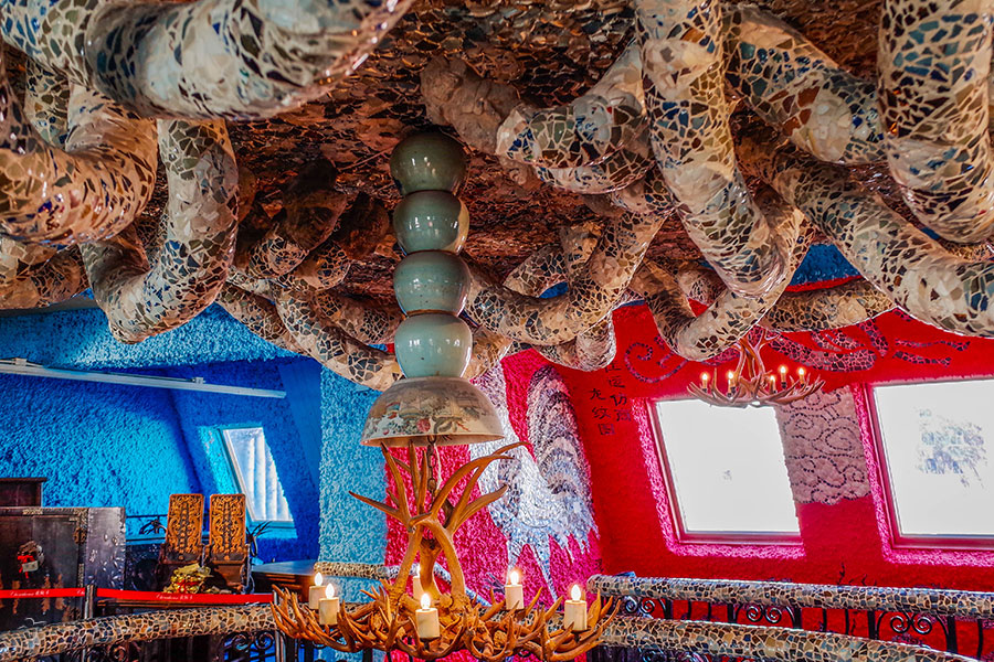 Covering an area of nearly 4000 square meters, the Porcelain House is decorated with over 400 million pieces of ancient Chinese ceramic chips, more than 5000 ancient porcelain vases, 4000 porcelain plates and bowls, as well as over 400 white marble carvings, 20 tons of natural crystals and agates, and over 300 stone lions in diverse sizes of different times. All the ceramic chips collected of dynasties of Song, Yuan, Ming and Qing are pasted on every space of the grand building make it gleaming under the sunshine. Completed for 5 years by Zhang Lianzhi, this original Porcelain House is of great antique flavors and no doubt the most characteristic and eye-catching building in the city attracting visitors home and abroad.