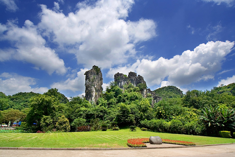 Seven Star Park's Camel Hill is one of the 10 top sceneries of Guilin. Lying at one entrance of the park and located behind Putuo Mountain, the Camel Hill is surrounded by the nearby Park's zoo, bonsai gardens, souvenir shops and teahouses. The rock formation looks indeed strangely like a huge camel standing in vast grassland, where locals and tourists like to have a rest and take memorable pictures. This natural rock formation due to erosion is something common in Guilin area as rocks, hills and peaks there can all remind you either of someone or something (what is also seen on the mountains surrounding the Li River). Famous tourist visit and local resting area, Camel Hill is also famous for being the place where U.S. President Bill Clinton gave a speech in 1998 on the need for environmental protection. In order to remember the event for Guilin area, a big carved stone stands in front of the site.