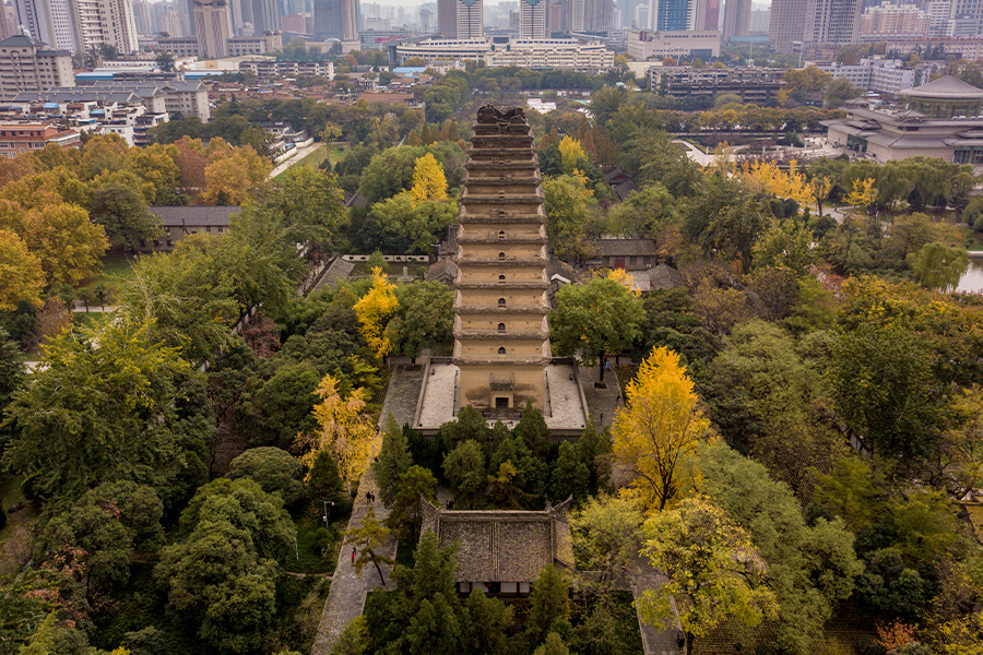 The Small Wild Goose Pagoda located inside the Jianfu Temple today was originally a 45-meter-high structure with 15 storeys. It was constructed in 707 AD in Tang Dynasty (618-907) to store the Buddhist sutras and objects that Master Yijing brought from India. It was named after "Wild Goose Pagoda" as well as the Big Wild Goose Pagoda due to the similar appearance and function.