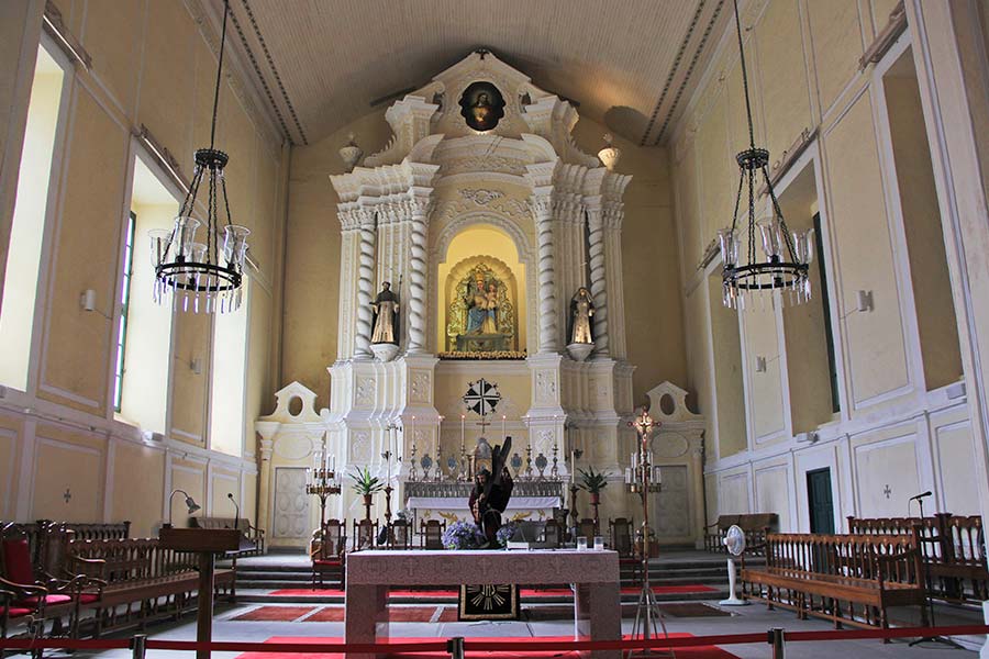The beautiful Portuguese colonial Catholic church has three halls. A few arched brick gates separate the nave with side halls and the main altar. The ceiling is carved with Spanish crowns. The main hall is resplendent with colored glasses. The statue of ''The Virgin and Child'' is placed on the altar and two statues of Christ nearby. Besides, a multitude of intriguing oil paintings and statues can be found in the church, including the outstanding statue of Jesus Christ. In 1991, the Macau government set out a maintenance project on the church. And the bell tower on the third floor was transformed into a museum called Treasury of Sacred Arts, housing various catholic Mass utensils and wood carving pieces.