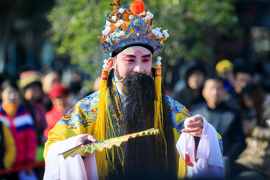 The theatre building, 21 meters high (69 feet) and 17 meters wide (56 feet), consists of three stories stages with colorful and multiple eaves elegantly raised on every corners. From top to bottom, there are: The Fu Stage (Happiness Stage), The Lu Stage (Affluence Stage), and The Shou Stage (Longevity Stage).