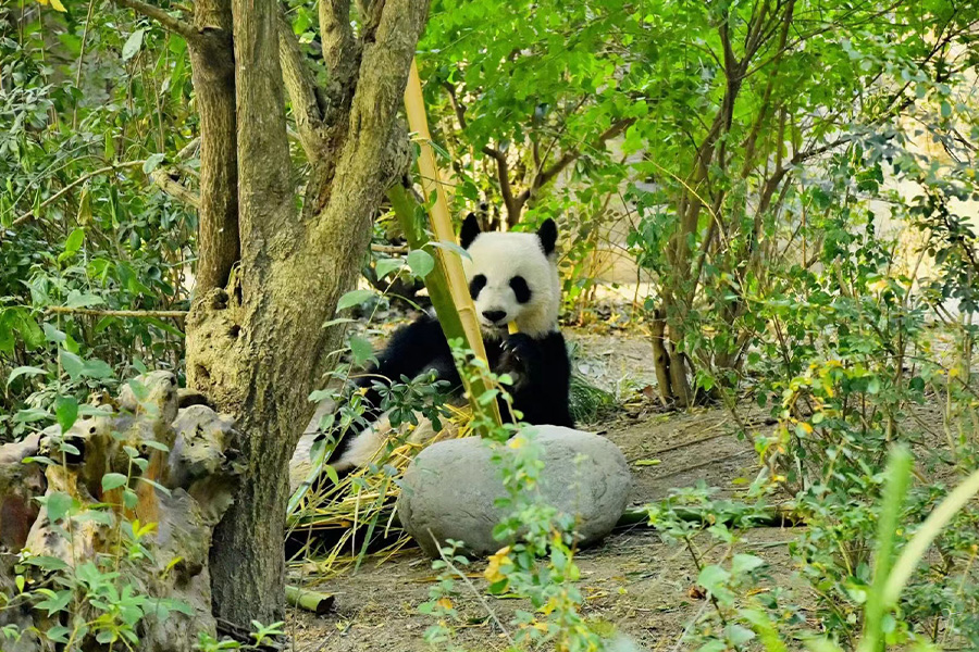 Today we will visit the Chengdu Panda Breeding Research Base, which was built to imitate the wild ecological environment of pandas. It covers a space of 92 acres, with a green coverage of 96 percent. The base created a perfect ecological environment for the living and breeding of pandas and other precious and rare wild animals. It breeds over 20 pandas and lesser pandas, black-necked cranes, white cranes and others.