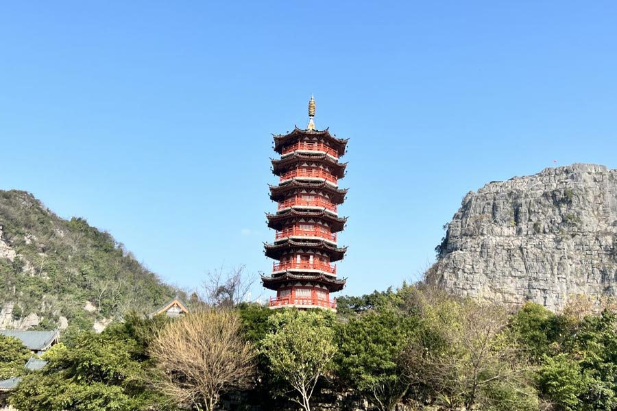 Standing in the China Fir Lake, the Sun and Moon Pagodas can offer you the panorama of the lake. The nine-tier Sun Pagoda, made of copper, 41 metres tall, is ornamented with exquisite copper murals. This pagoda has set three records – the tallest copper pagoda, the tallest copper construction, the tallest pagoda in the water. Regarding the seven-tier Moon Pagoda it is a glazed tile pagoda, 35 metres tall. Tracing the origin of the stream you can sight of the bronze statue of Wang Zhenggong who once sang the praise of Guilin – "East and west, Guilin scenery is best".