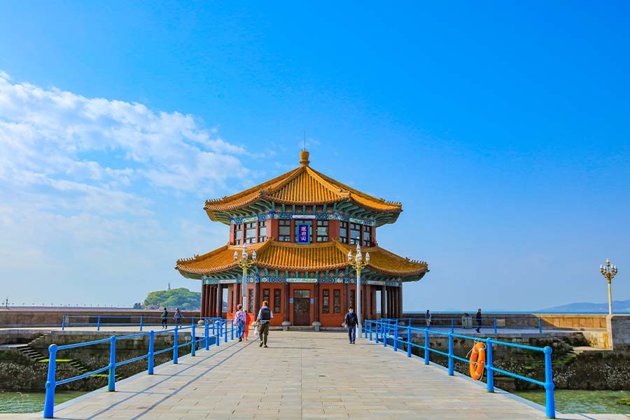 Zhan Bridge, also known asQianhaiZhanBridge,NanhaiZhanBridgeand Grand Pier, is the icon ofQingdaoCity. It is located in the southern coast ofQingdaoCity, starting from the southern end ofZhongshan Roadand stretching into the broad sea in the end.ZhanBridgewas originally established in 1892 with a width of 10 meters and a length of 200 meters and became the earliest military pier inQingdaoCity. Then the bridge was turned to be a freight pier after being invaded byGermany. Later in 1901, it was expanded from several aspects: iron rail was replaced by iron chain rail; the whole bridge lengthened to 350 meters; the road paved with railway rail; etc. Around 1905,QingdaoHarborwas the major place for commodity transport andZhanBridgeserved as an exclusive port for quarantining and piloting ships intoQingdaoharbor. The local government improved the bridge with an investment of CNY 258,000 from September, 1931 to April, 1933. Partial steel and wood structure of the original bridge was replaced by reinforced concrete and the whole road was covered with cement. The length was expanded to 440 meters and the bridge was heightened another 0.5 meter. A half-round shape sea wall was built up on the south. What’s more, a two-storey octagonal pavilion with typical ethnic architectural style was founded here, which is named Huilan Pavilion and enjoys great fame. Stretching above the shoal of the sea, Zhan Bridge of Qingdao City looks like a dragon sleeping comfortable and peacefully. Soft waves blow the bridge, hundreds of seagulls screech here and there, and stunning sunrise and sunset emerge in the boundless blue sea. It is a paradise for human beings and creatures. As time goes by, the place is gradually viewed as one of the major landmarks ofQingdaoCityand also a great scenic spot to explore inChina.